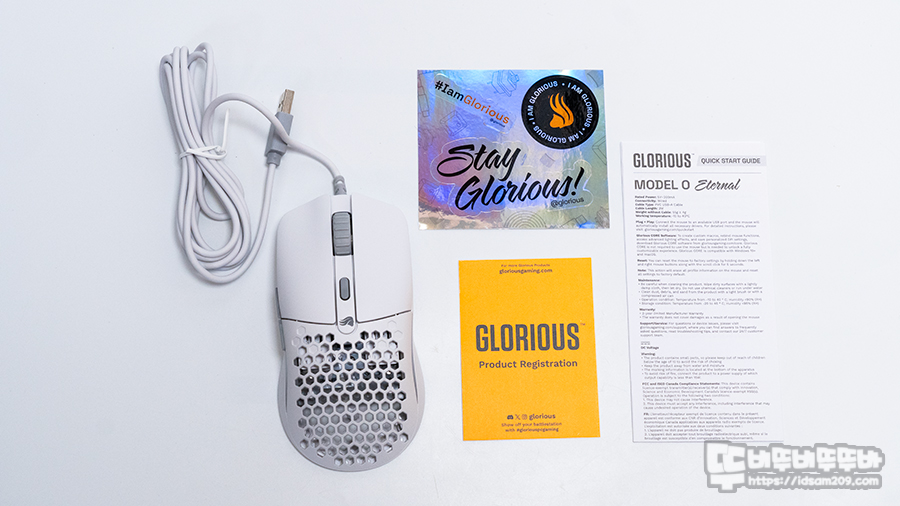 제품은 Model O Eternal 마우스 본체와 브랜드 스티커, 간단 안내서 그리고 정품 등록 안내 카드 등으로 구성되어 있습니다.