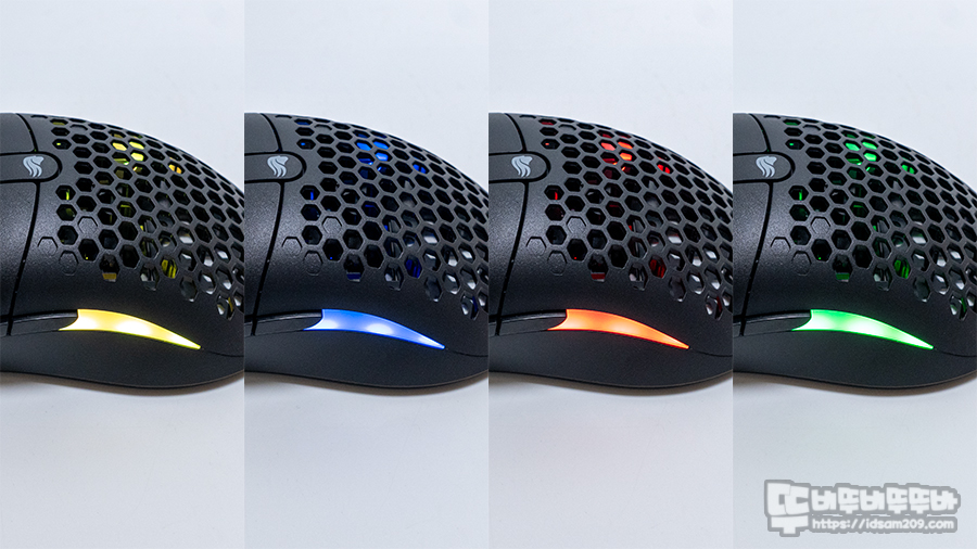 왼쪽과 오른쪽에 하우징 측면에 LED 라이팅이 투영되는 디퓨저가 적용되어 다양한 RGB 효과 및 DPI 단계를 잘 표현해 줍니다.