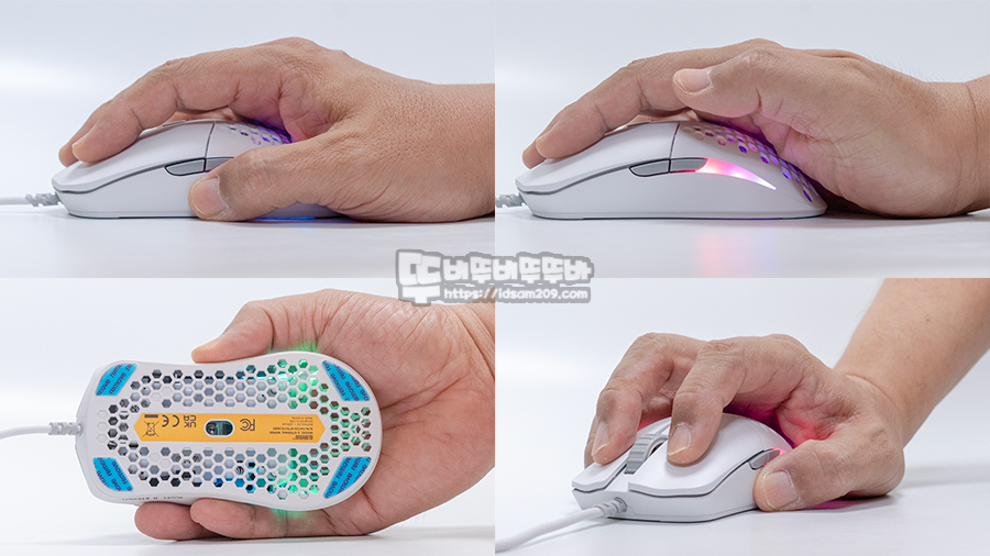 넓게 디자인된 메인 버튼과 휠 다이얼, DPI 변경 버튼 그리고 사이드 버튼으로 구성된 심플한 구조를 가지고 있으며 허니콤 디자인이 적용된 상하판 덕에 장시간 게임을 하더라도 손바닥에 습기가 느껴지지 않네요.