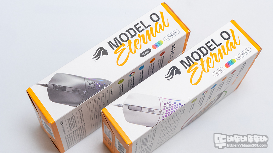 MODEL O ETERNAL 패키지는 기존의 두툼함과 거리가 있는 슬림하면서 가벼운 느낌을 주며 전면 인쇄 내용에서는 제품 컬러에 맞는 제품 이미지와 55g의 가벼운 무게 그리고 제품의 컬러 정보를 확인할 수 있습니다.