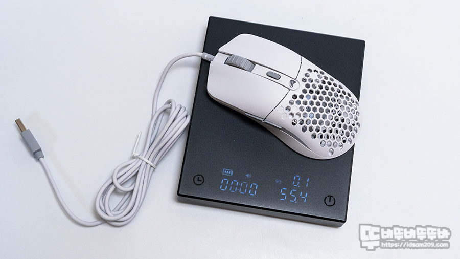 1g 단위로 측정 가능한 디지털 저울로 무게를 측정해 보니 약 55g으로 가벼운 무게를 확인할 수 있습니다.