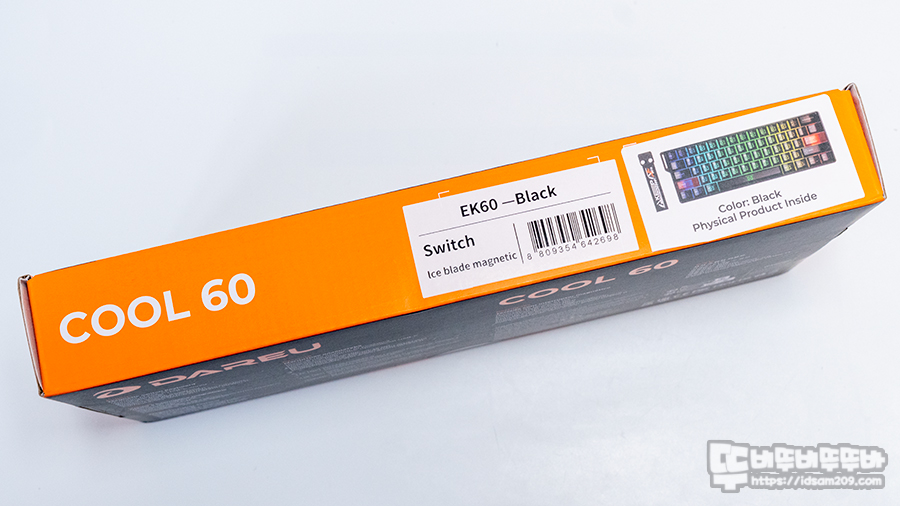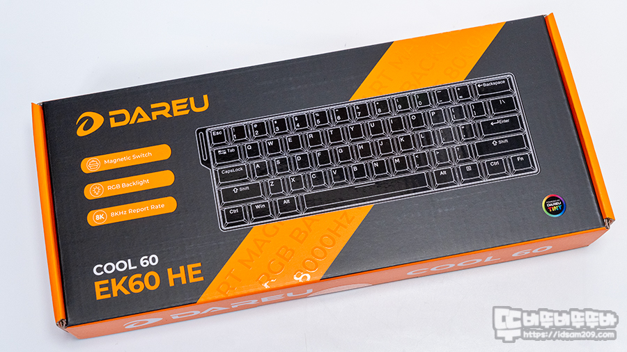 다얼유 EK60 HE 패키지는 제품의 레이아웃 이미지와 자석축 스위치, RGB 백라이트, 8K 폴링 레이트 지원을 강조하고 있습니다.