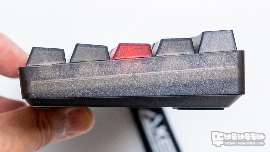 좋은 점은 PC 소재지만 끈적이는 느낌 없이 뽀송뽀송한 느낌을 주며 반투명 소재지만 영문과 한글 각인이 잘 표현되어 있습니다.