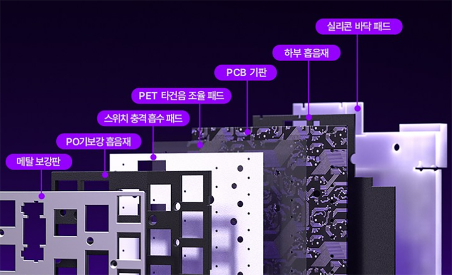메탈 보강판과 PCB 기판 사이에 1)기보강 흡음재 + 2)스위치 충격 패드 + 3)PET 패드, PCB 기판과 하우징 사이에 4)하부 흡음재 + 5)실리콘 바닥 패드 구성으로 키보드 뒷부분을 두들겨도 통울림이 없는 완벽한 저 소음 키보드 베이스를 갖추고 있습니다.