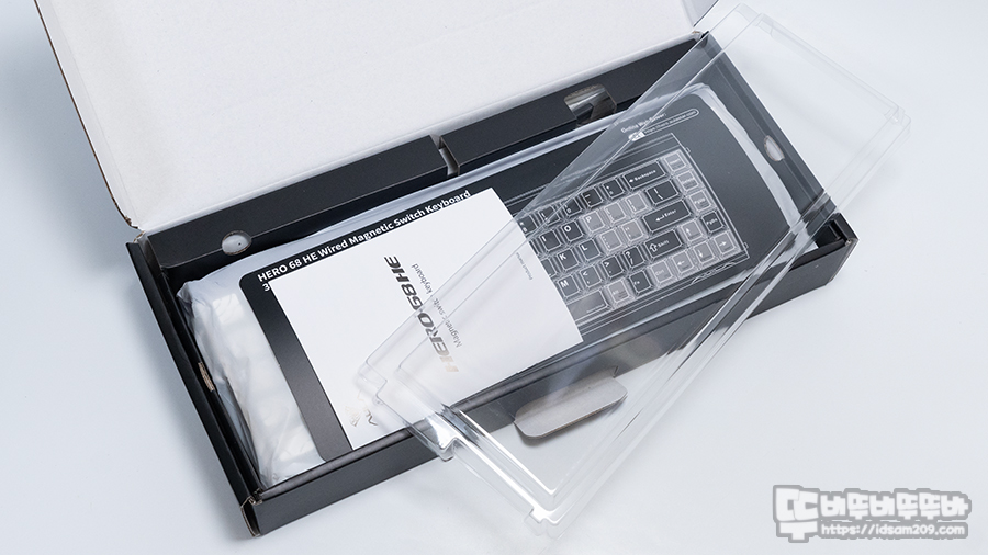 AULA Hero68HE 패키지는 심플한 블랙 패키지에 Hero68HE 모델명 마그네틱 스위치 키보드라는 내용으로 제품의 정체성을 잘 표현해 주고 있습니다.