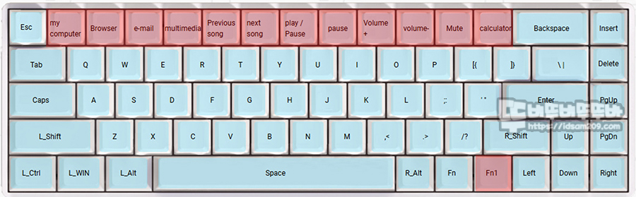 추가로 Fn2 레이어에는 숫자열 부분이 멀티미디어 키로 활용이 가능하여 키 구성이 적은 68키 레이아웃이지만 Fn 레이어, Fn 2 레이어를 활용하여 부족한 키 기능을 보완할 수 있으며 Fn2 기능은 Fn 키를 누른 상태에서 추가로 Fn2(R_Ctrl) 키를 눌러 사용하시면 됩니다.