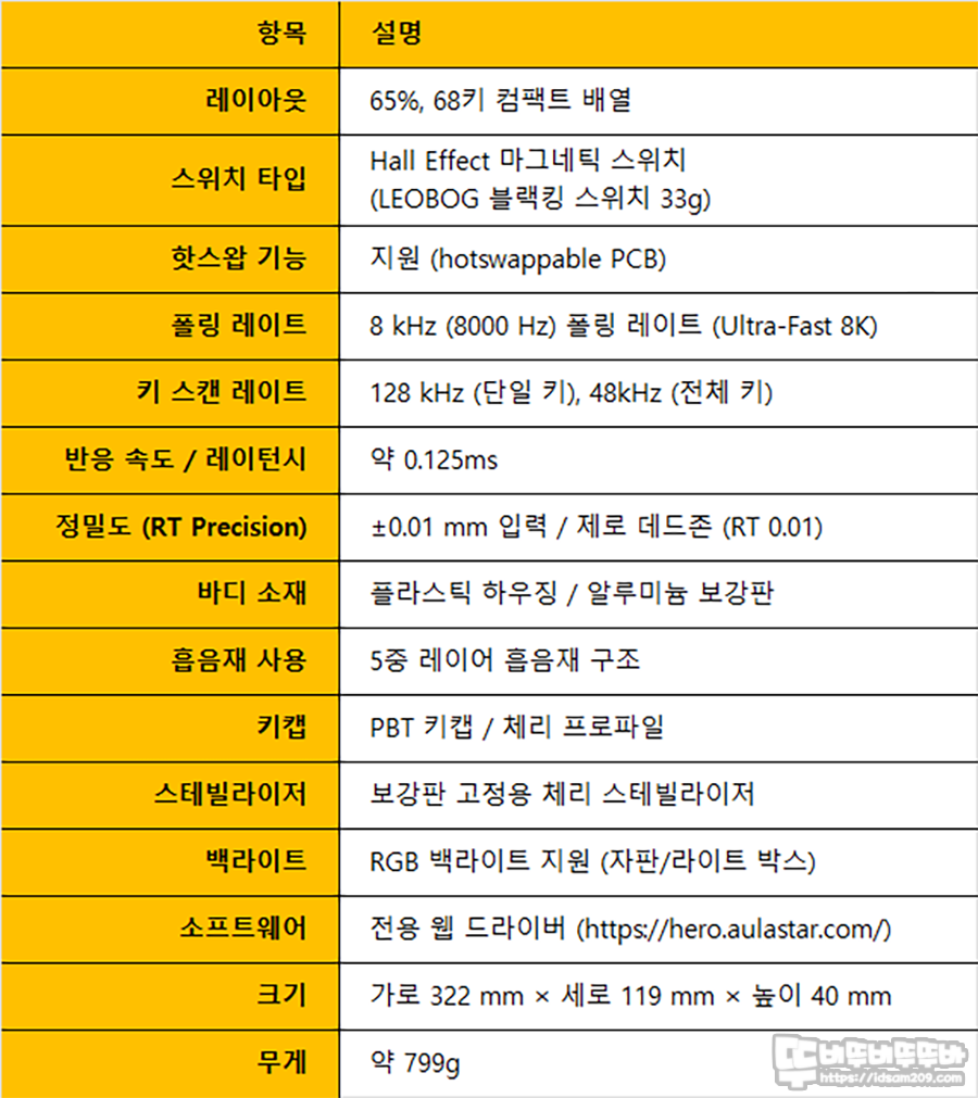 지금까지 AULA Hero68HE 아우라 독거미 8K 자석축 키보드에 대하여 알아보았습니다.