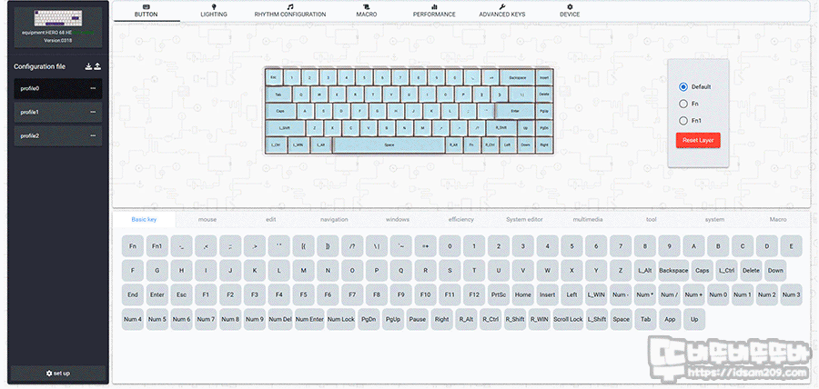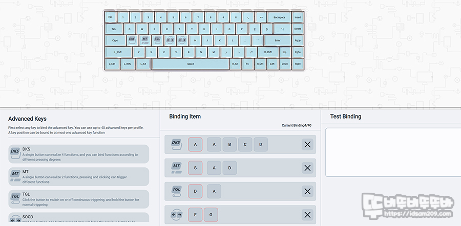 소프트웨어 구성은 키 기능을 변경하는 키맵핑, RGB LED 효과, 매크로, 퍼포먼스(입력 지점 선택 및 래피드 트리거 선택), 어드밴스드 키(DKS, MT, TGL, SOCD), 디바이스(폴링 레이트) 등의 선택이 가능합니다.