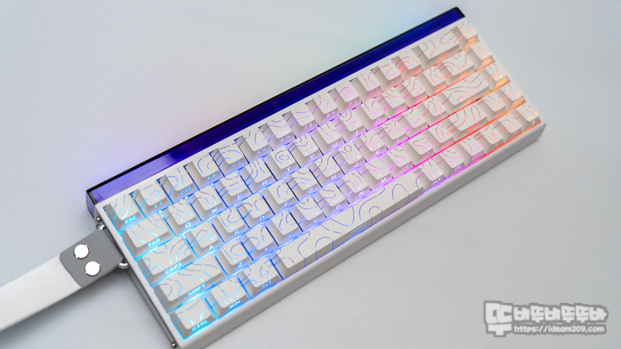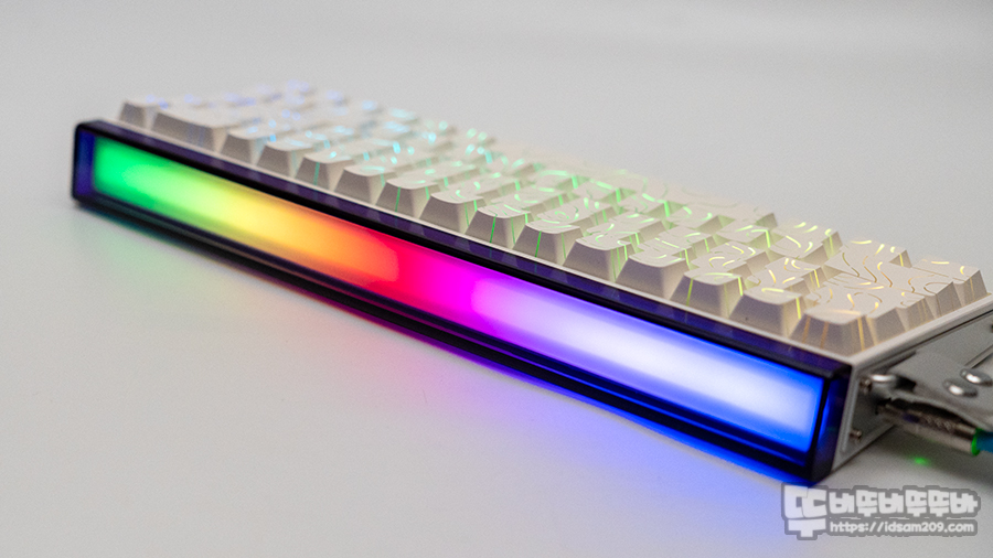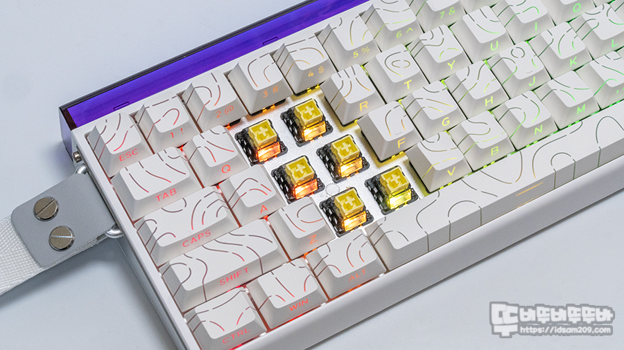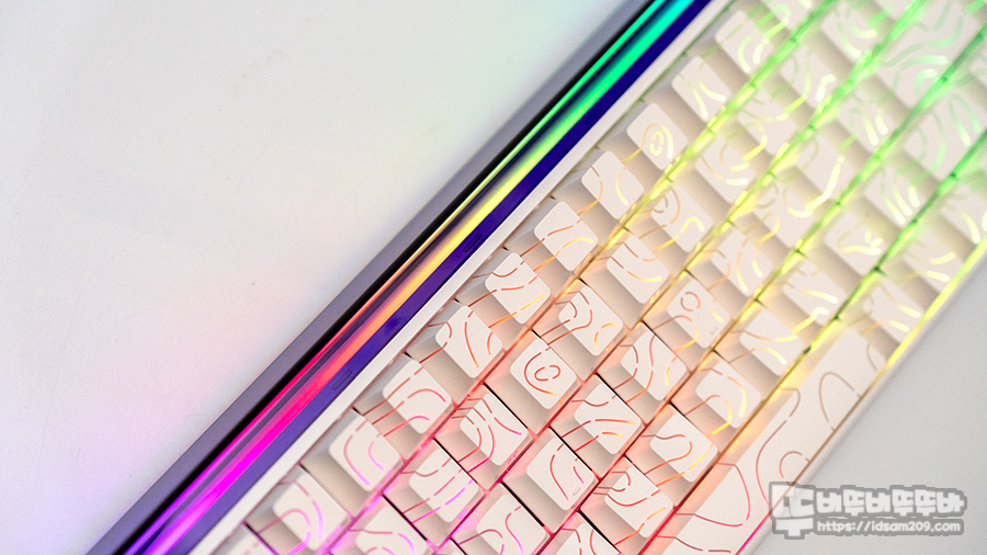 화이트 컬러를 베이스로 하는 하우징과 키캡과 언밸런스한 컬로 조합이기에 이게 뭔가? 했는데 키보드를 PC에 연결하고 나서 RGB LED 효과를 표현하는 라이트 박스라는 것을 알게 되었습니다.