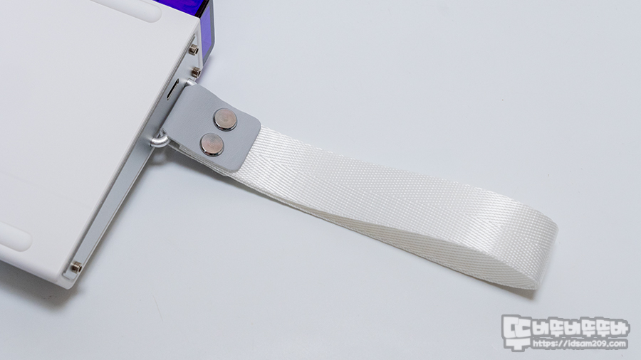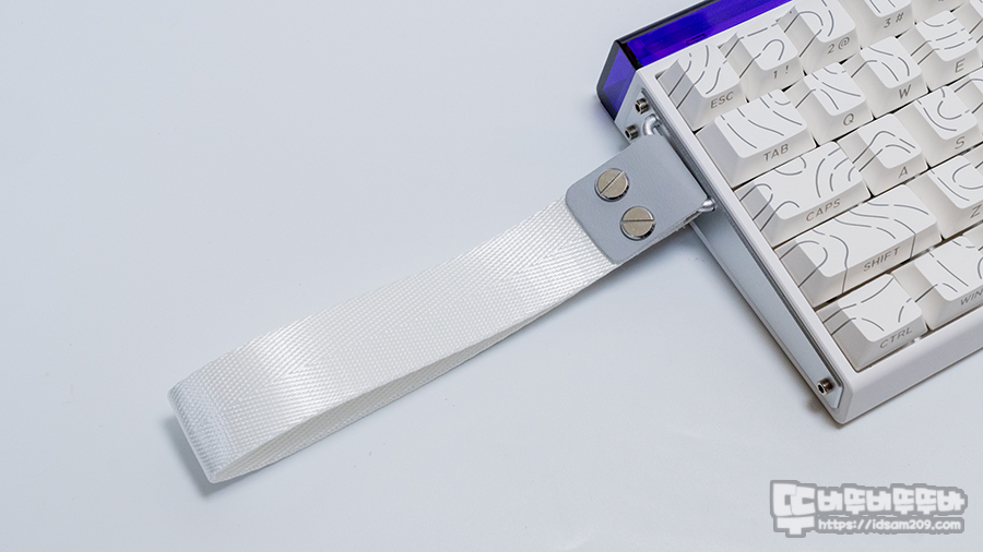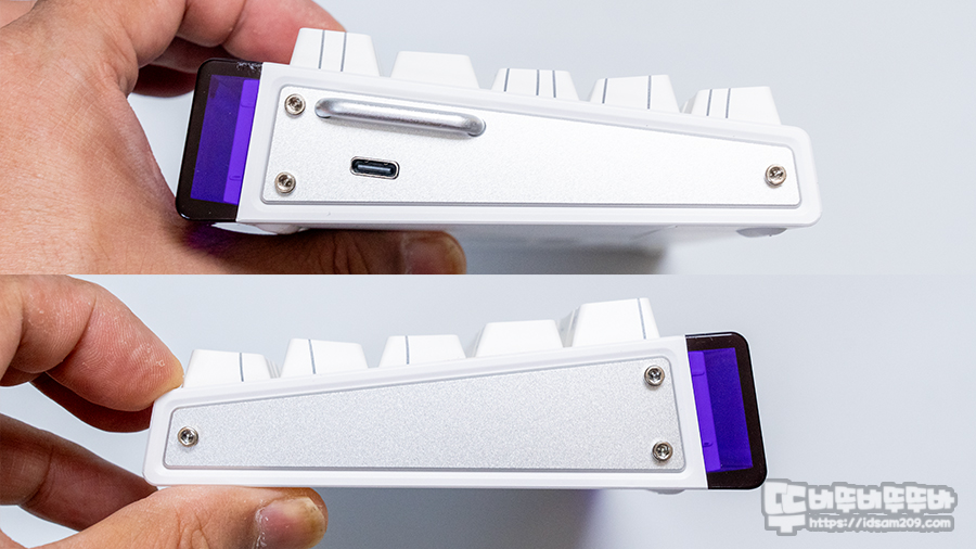키보드의 측면은 메탈 소재가 사용되어 있는데 왼쪽 부분은 스트랩을 연결할 수 있는 고리와 USB-C 단자가 위치하고 있으며 위쪽 부분에는 보라색 투명 플라스틱이 눈의 띄는데요.