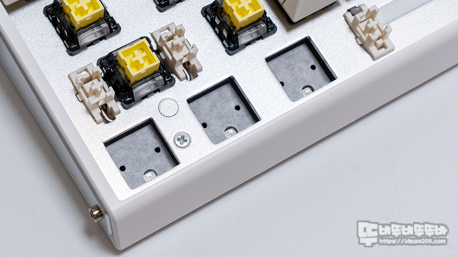 메탈 보강판과 PCB 기판 사이에 1)기보강 흡음재 + 2)스위치 충격 패드 + 3)PET 패드, PCB 기판과 하우징 사이에 4)하부 흡음재 + 5)실리콘 바닥 패드 구성으로 키보드 뒷부분을 두들겨도 통울림이 없는 완벽한 저 소음 키보드 베이스를 갖추고 있습니다.