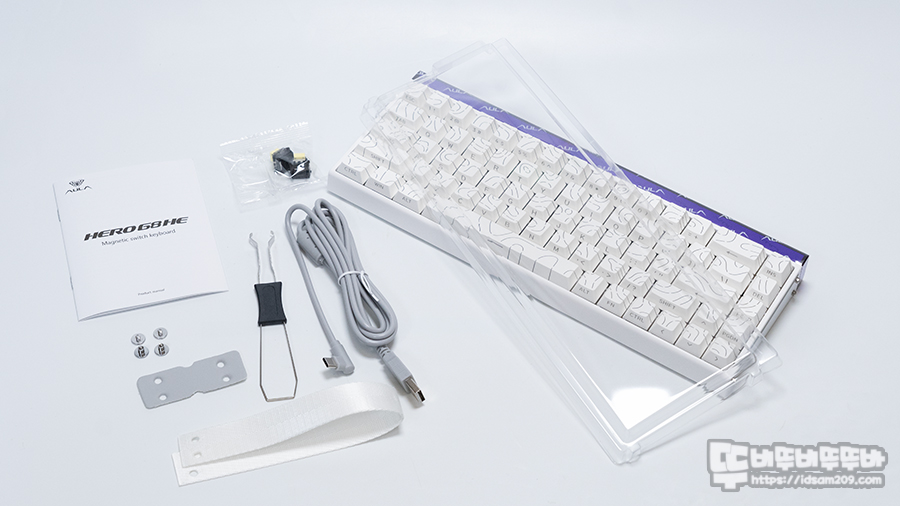 제품은 키보드 본체, USB-C to A 케이블, 키캡 & 스위치 리무버, 사용 설명서, 스트랩, 투명 블리스터 키보드 커버, 여분 스위치 2개로 구성되어 있습니다.