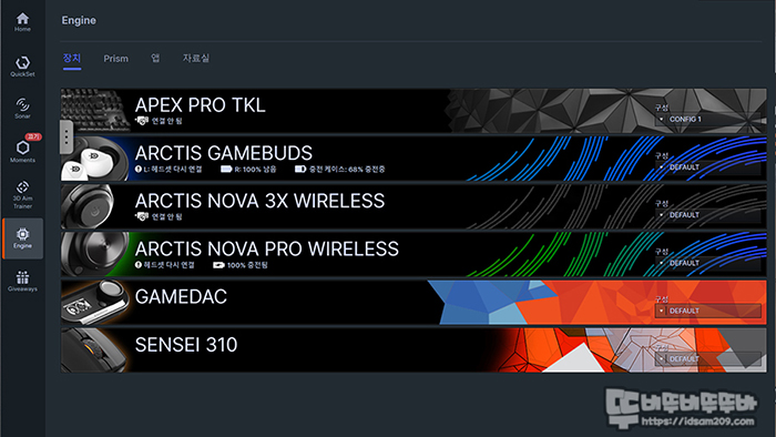 제품 정보를 확인할 수 있는 Engine 메뉴를 클릭 시 PC에 연결된 스틸시리즈 장치명을 모두 보여주는데 Arctis Gamebuds 항목을 보면 무선 이어버드 및 충전 케이스의 배터리 잔량을 확인할 수 있습니다.