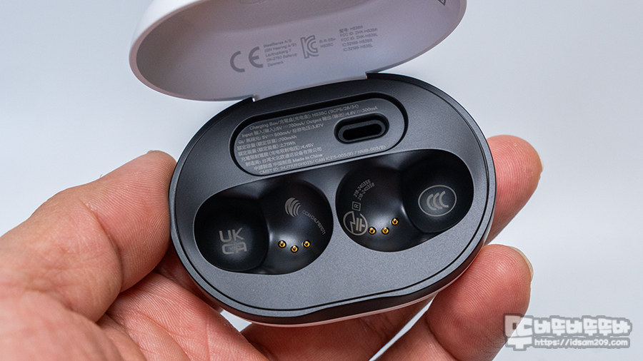 충전 케이스를 오픈하면 무선 이어버드와 2.4GHz 무선 리시버가 수납된 것을 확인할 수 있는데 무선 리시버의 USB-C 단자 부분은 실리콘 가이드에 고정되는 형태이며 무선 이어버드와 충전 케이스 커버는 내장된 자석으로 부착되는 형태로 안정감을 주네요.