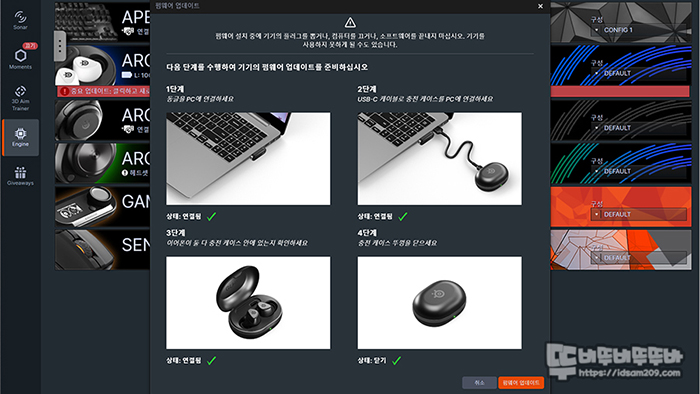 2.4GHz 무선 리시버를 본체에 연결하고 무선 이어버드가 들어있는 충전 케이스도 PC에 연결하여 펌웨어를 진행하였는데 SteelSeries GG에서 펌웨어 시 위와 같이 연결 상태를 모두 V 체크가 되어야 진행하니 참고하시기 바랍니다.
