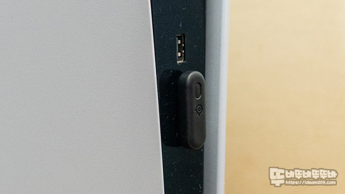 무선 리시버와 아답터를 연결했을때 딸깍하는 소리는 내면서 결합이 되는데 결합 이후의 모습은 위의 사진과 같이 살짝 덜 들어간 느낌으로 보이니 오해 없으시기 바랍니다.