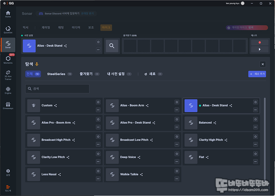 SteelSeries GG를 실행하면 Engine 항목에 등록된 ALIAS 제품명을 확인할 수 있는데요.