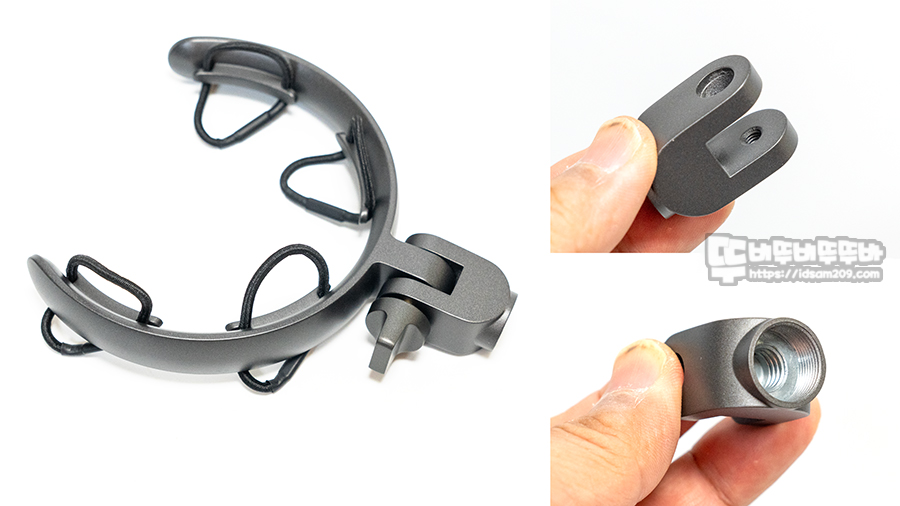 쇼크 마운트 거치대 결합은 구멍이 넓은 쪽에 결합되는 홈이 있으니 홈에 맞게 잘 맞춰서 고정 너트를 조여주면 되고요.