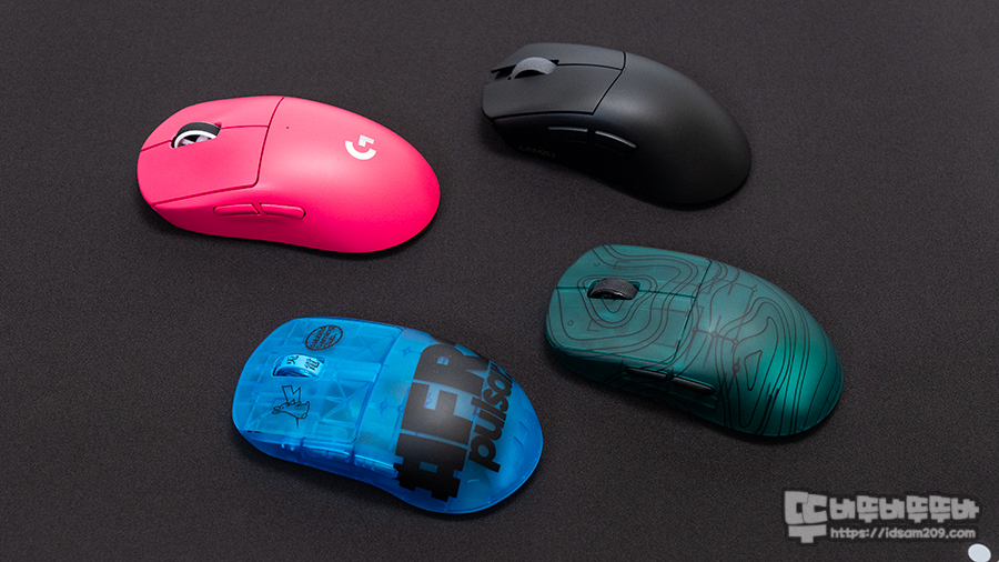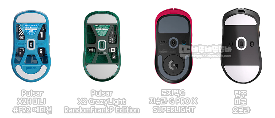 54g 펄사 X2H #FR 에디션, 67g 로지텍 G PRO X 슈퍼라이트 (Qi 충전 코인을 사용하고 있어 무게가 조금 추가됨)