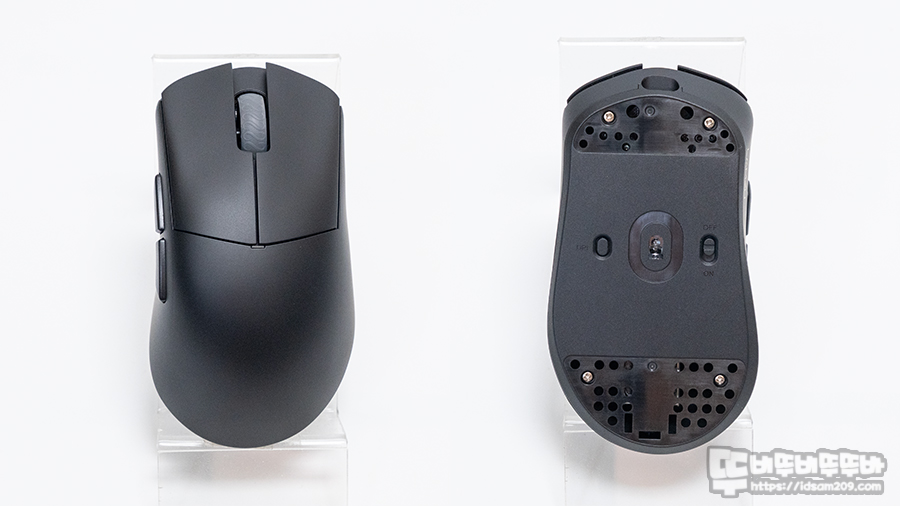 바닥면에는 센서 좌우로 전원 On/Off 버튼과 DPI 버튼이 위치하고 있으며 마우스 피트는 부착되지 않아 상판 쉘을 고정하는 나사가 모두 노출된 상태를 확인할 수 있습니다.