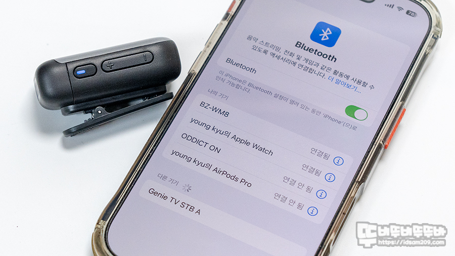 최초 전원을 켰을 때 블루투스 페어링 모드로 진입하는데 스마트폰의 블루투스 기기 리스트에 등장하는 BZ-WMB를 선택하면 페어링이 되며 최초 페어링 이후에는 전원을 켜면 오토 페어링으로 간편하게 사용할 수 있습니다.
