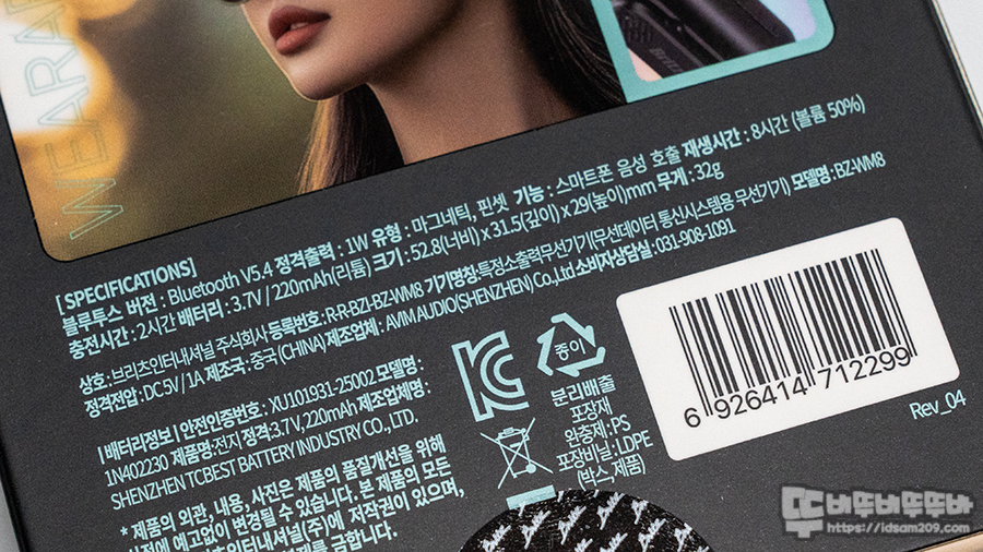 블루투스 버전 5.4 / 출력 1W / 거치 방법 : 마그네틱, 핀셋 클립 / 배터리 : 220mAh / 충전 시간 : 2시간 / 재생 시간 : 8시간 (볼륨 50%) / 크기 : 52.8 X 31.5 X 17mm (클립 장착 시 : 29mm) / 무게 : 32g 등의 정보를 확인할 수 있습니다.