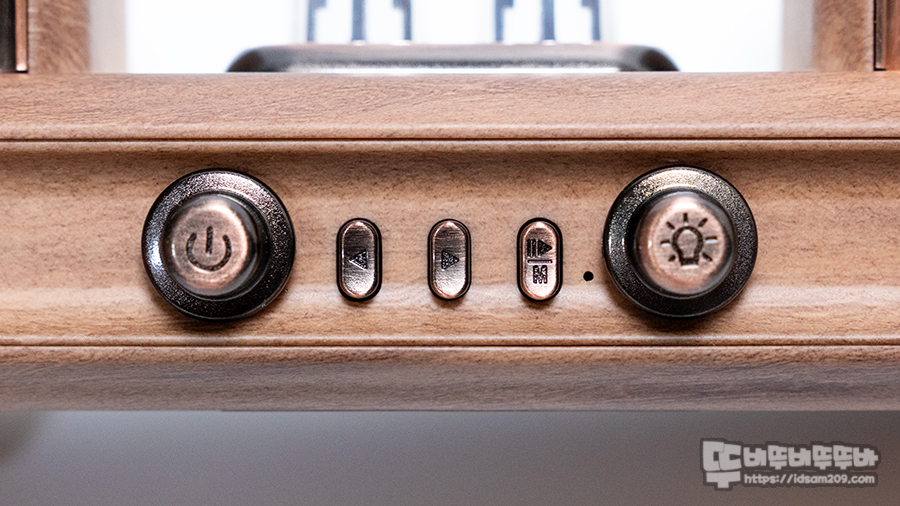 가운데 좌우 버튼은 트랙/라디오 채널 이동, 재생/일시 정지는 짧게 눌러서 재생/일시 정지, 길게 눌러서 입력 모드 변경 (블루투스, FM 라디오, USB 메모리, TF카드, AUX in) 기능을 지원으로 다소 기능이 많아 보이지만 시계 기능이 없어서 그런지 심플하더라고요. ㅎㅎ