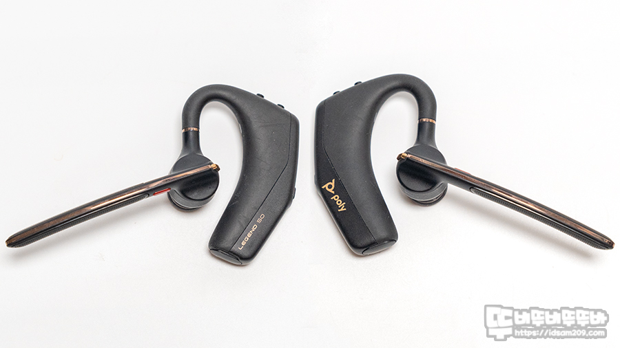 폴리 보이저 레전드 50은 행거 형태의 베이스를 기준으로 마이크와 연결된 이어버드를 180도 회전과 마이크 스틱의 230도 회전을 지원하여 왼쪽 또는 오른쪽에 착용하더라도 같은 형태로 사용할 수 있습니다.