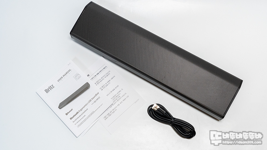 제품은 브리츠 BZ-MK22 사운드바 본체와 USB-C to A 충전 케이블 그리고 사용 설명서로 구성되어 있습니다.