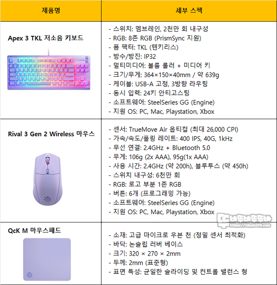 #Steelseries #스틸시리즈 #Glowup #Apex3TKL #저소음키보드 #Rival3Gen2 #무선마우스 #QcK #M #마우스패드 #라벤더 #아쿠아 #블랙 #화이트 #세트 #데스트테리어아이템 #idsam209 #뚜비뚜비뚜뚜바