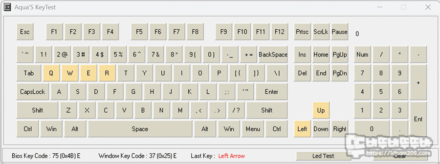 32키 안티고스팅을 지원하는 맴브레인 키보드이기에 대각선 방향의 방향키를 누른 상태에서 QWER, ASDF, ZXCV키를 순차적으로 눌러 라인별로 동시 입력이 되는 것을 확인할 수 있고요.