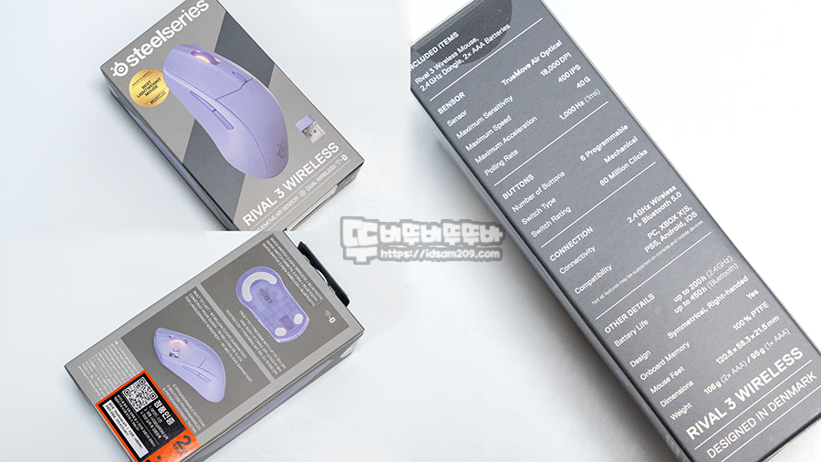 스틸시리즈 Rival 3 Gen2 무선 게이밍 마우스는 앞서 스펙으로 언급한 내용과 같이 18k DPI를 지원하는 트루무브센서와 1kHz 폴링레이트, 6천만 회 클릭 스위치 그리고 RF 2.4GHz + 블루투스 듀얼 무선, AAA건전지 2개를 사용하여 최대 200시간(2.4GHz) / 450시간(BT) 사용이 가능한 제품으로 하루평균 6시간 사용 시 약 75일(BT기준) 사용이 가능한 게 특징입니다.