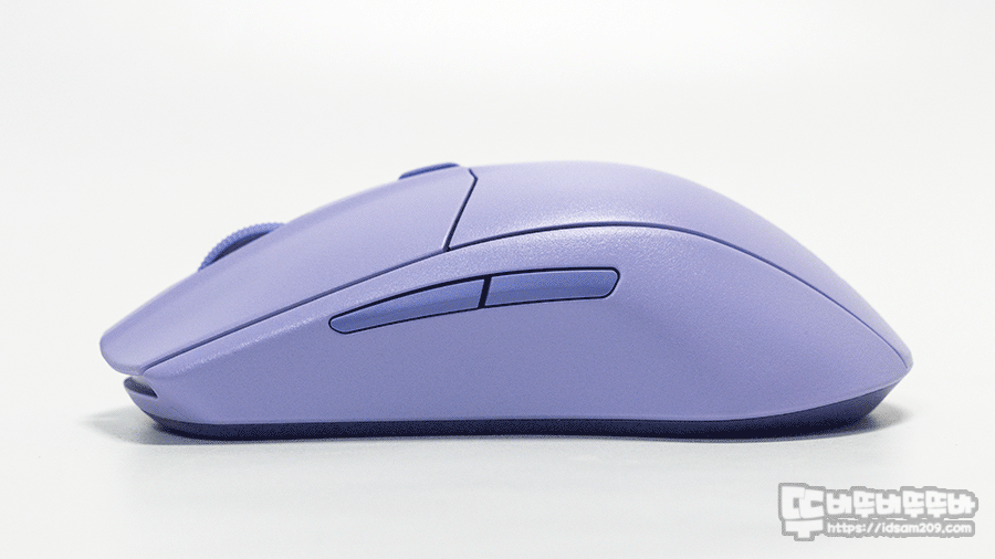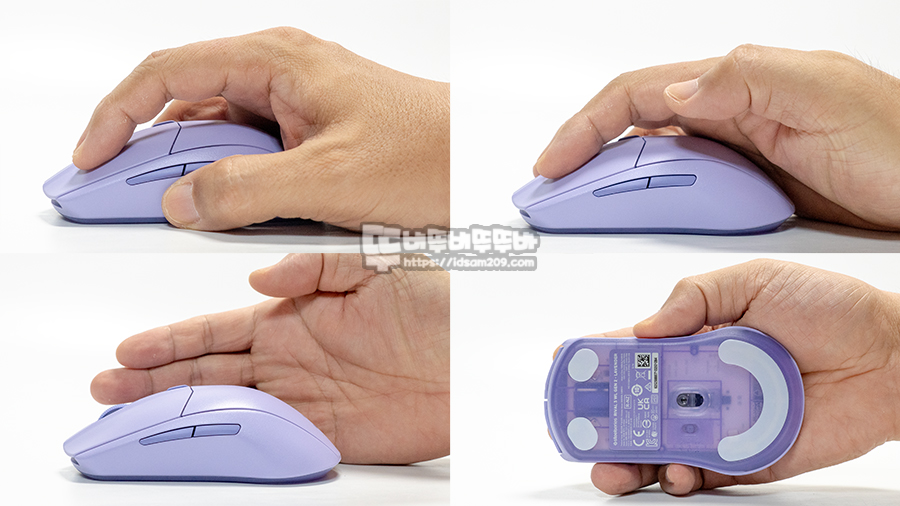 대칭형이지만 오른손에 잡이로 출시되어 마우스 왼쪽에 사이드 버튼이 위치하고 휠 다이얼과 DPI 버튼이 마우스 상단에 위치하고 있으며 바닥면에는 전원 On/Off, 2.4GHz/블루투스 연결을 선택할 수 있는 셀렉트 스위치가 위치하고 있는데요.
