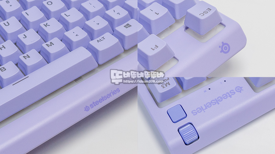 87키 텐키리스로 디자인된 Apex 3 TKL은 우측 상단에 볼륨 다이얼과 멀티미디어 제어 버튼이 따로 위치하고 있어 편리하게 사용이 가능하며 기존의 Apex 디자인을 계승하고 있습니다.