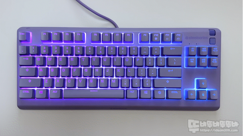 Apex 3 Tkl의 RGB 라이팅은 맴브레인 방식의 접점 필름 아래에 위치한 라이트 가이드 필름 구조를 통해 8개로 세분화된 라이팅 존을 통해 다이내믹한 LED 효과를 표현하는데 RGB 백라이트 광량이 생각보다 밝은 편이라 웬만한 키보드의 백라이트보다 만족스러운 편입니다.