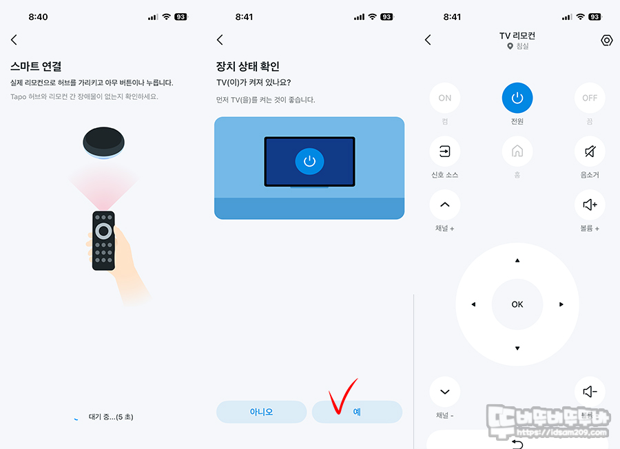이유는 TV 모델을 선택 후 진행 중에 TV 리모컨의 아무 버튼을 눌러주면 자동으로 인식을 하게 되며 별도의 설정 없이 TV 리모컨 기능을 그대로 가져와 사용할 수 있습니다.