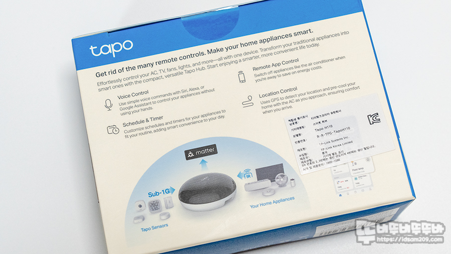 패키지 뒷면에는 음성 제어(시리, 알렉사, 구글 어시스턴트를 사용하여 간단한 음성 명령), 일정 및 타이머, 원격 앱 제어, 위치 제어 등 hub에 연결된 기기를 통합으로 관리할 수 있는 특징을 강조하고 있습니다.