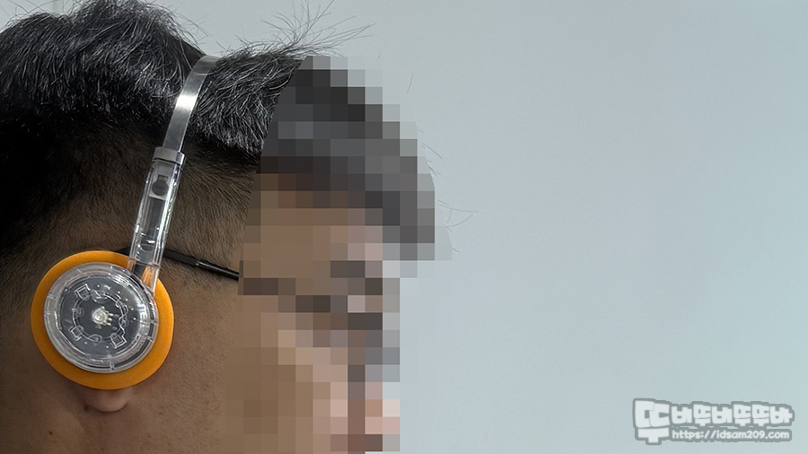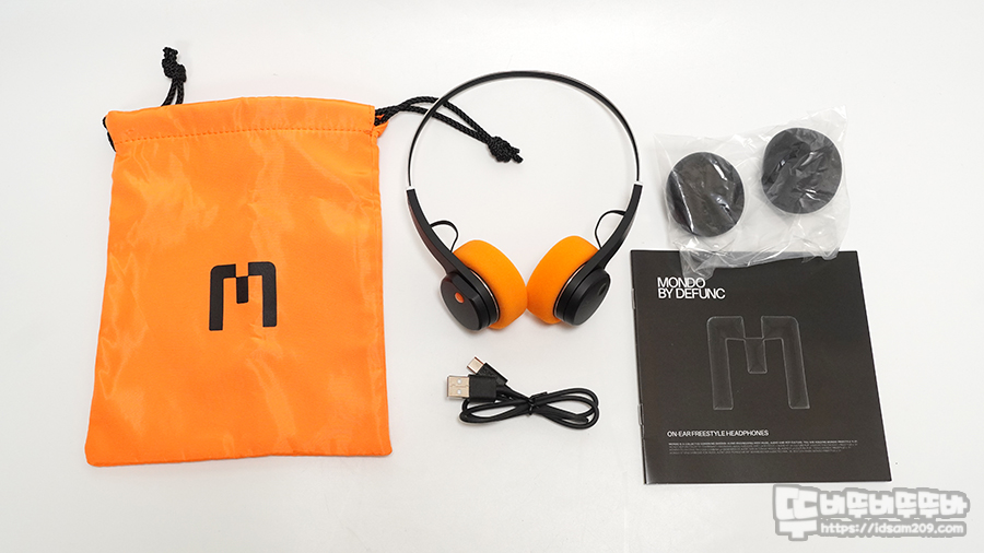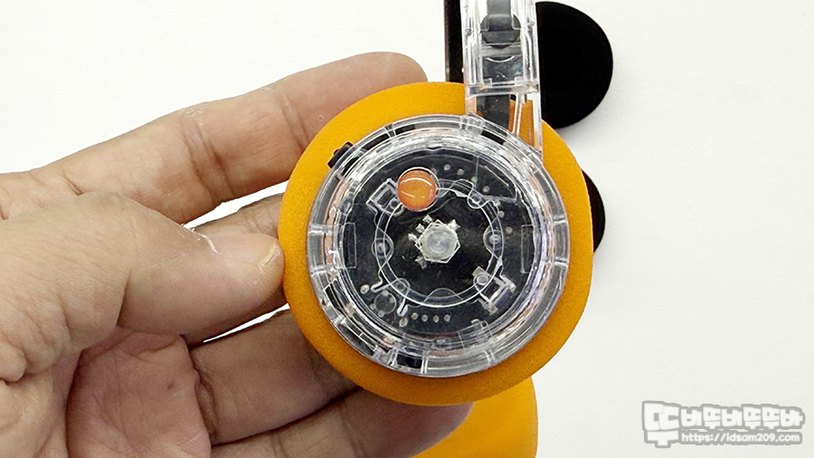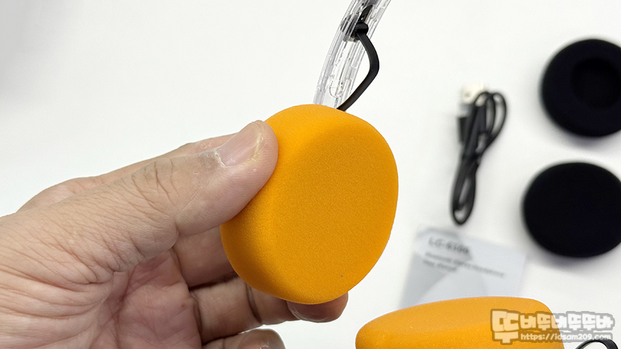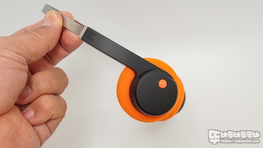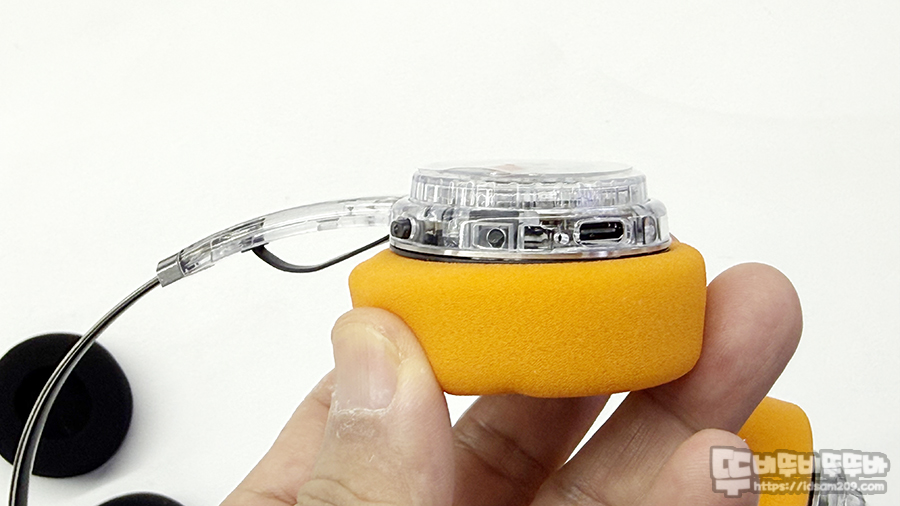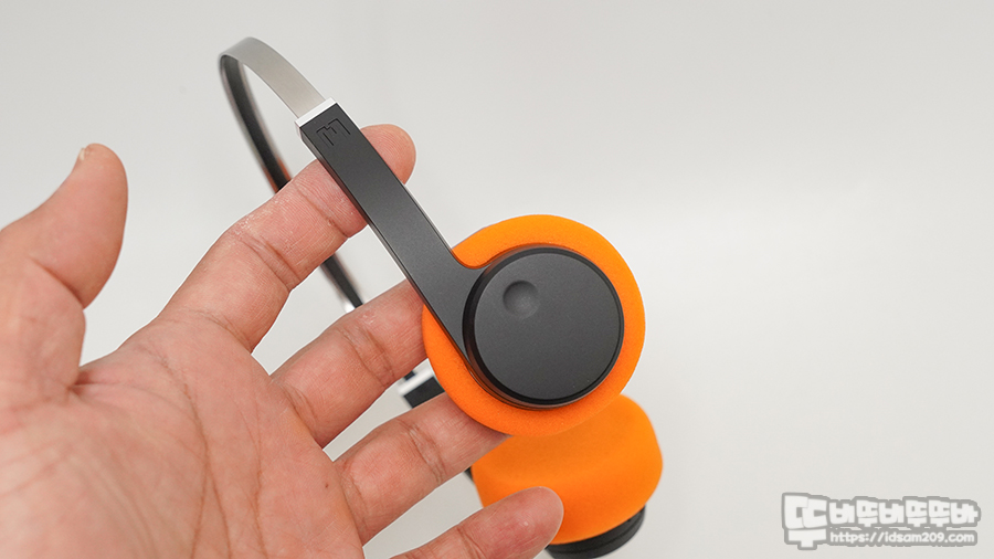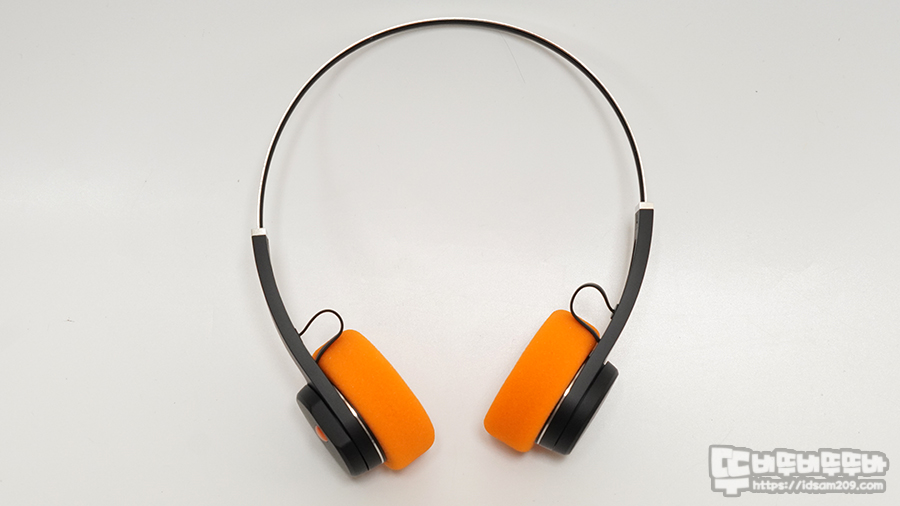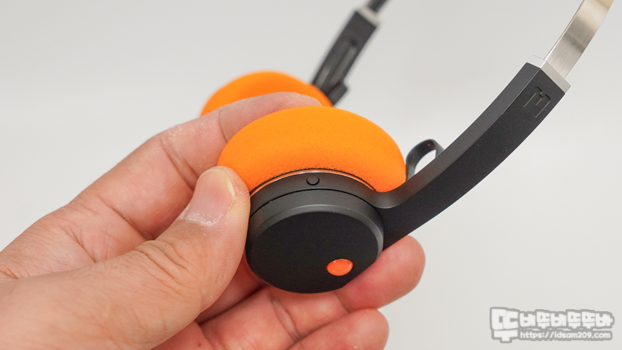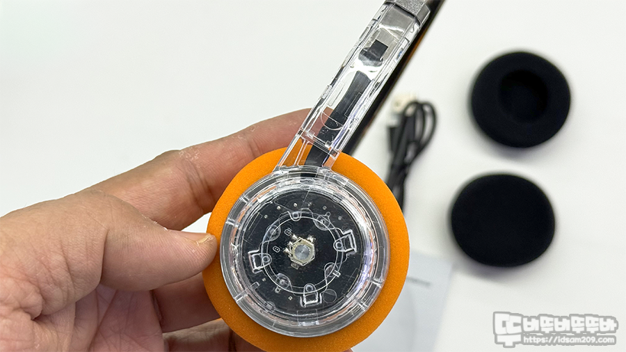 기본 오렌지 스펀지를 부착하고 있으며 헤드셋 스피커 유닛이 들어있는 헤드 부분의 플라스틱이 두께가 있어 두툼해 보이는 거지 스펀지는 쿠션감이 없으니 참고하세요.