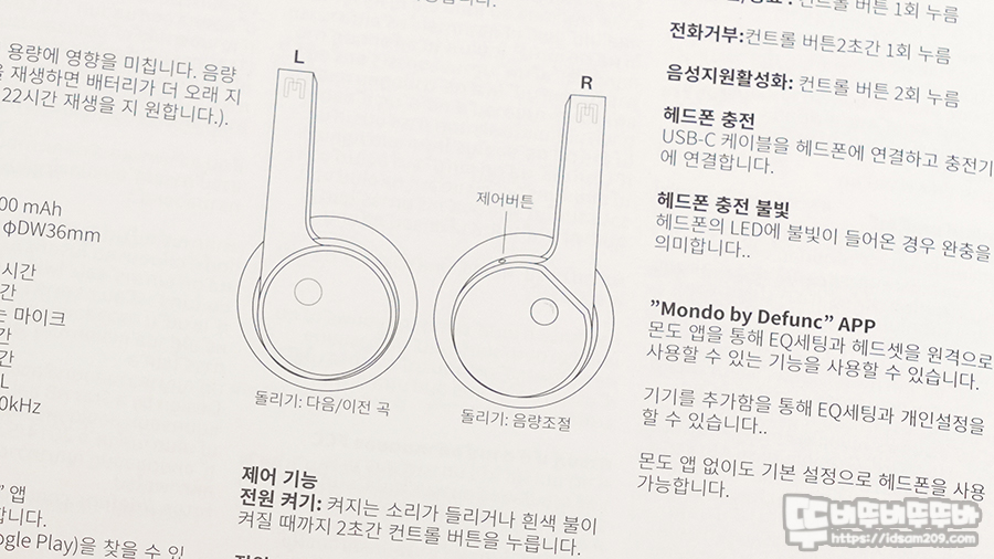각 파츠에 대한 설명도 있고 원버튼 컨트롤로 구성과 좌우 헤드 부분에 휠 방식의 트랙 이동과 볼륨 제어를 지원하고 전용 앱을 이용한 EQ설정도 지원하는 게 특징입니다.