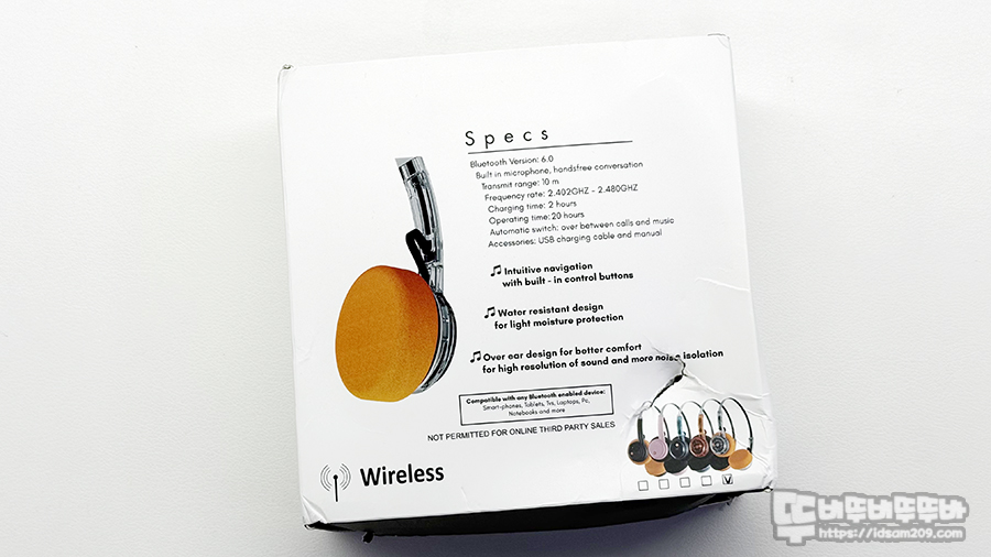 뒷면에 스펙 정보에는 블루투스 6.0 / 충전 2시간 / 20시간 사용 그리고 제품의 다양한 컬러를 강조하고 있습니다.