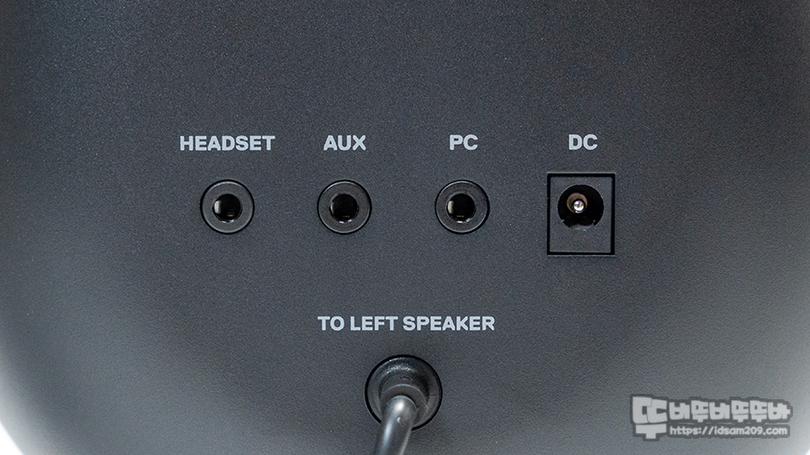 스피커 뒤쪽에는 L. R 표기로 좌우를 구분하는 마킹과 왼쪽에는 오른쪽 스피커를 연결하는 단자, 오른쪽 스피커 뒤쪽에는 전원 소켓, 헤드셋, AUX, PC를 연결할 수 있는 3.5mm 연결 단자로 구성되어 오른쪽이 마스터 유닛임을 확인할 수 있습니다.