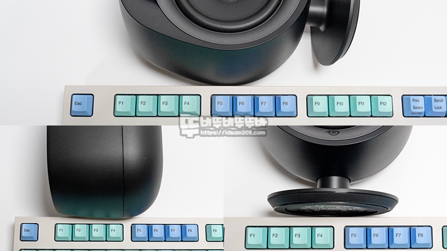 박스가 큰 만큼 스피커도 생각보다 큰 편인데 키보드 펑션키 기준 높이를 살펴보면 F10, 두께는 F6 절반, 폭은 F8 절반 크기로 모양은 둥글둥글하게 보이지만 전체적으로 북쉘프 디자인 제품과 비슷한 크기로 디자인되었습니다.