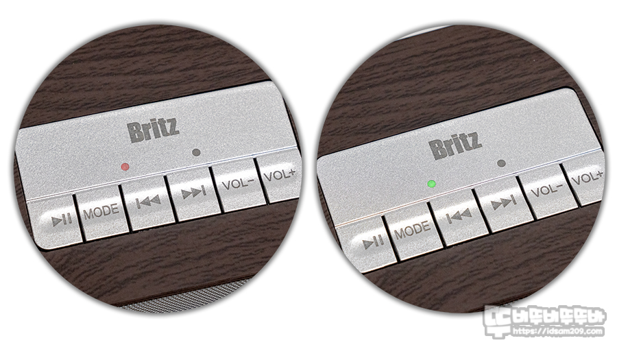 입력 모드가 변경되는 경우 오른쪽 LED 인디케이터가 블루투스 (블루), USB & MicroSD, AUX 입력(그린)으로 표현되니 입력 모드에 따른 LED 인디케이터 변화를 잘 확인하시면 사용하는데 도움이 됩니다.