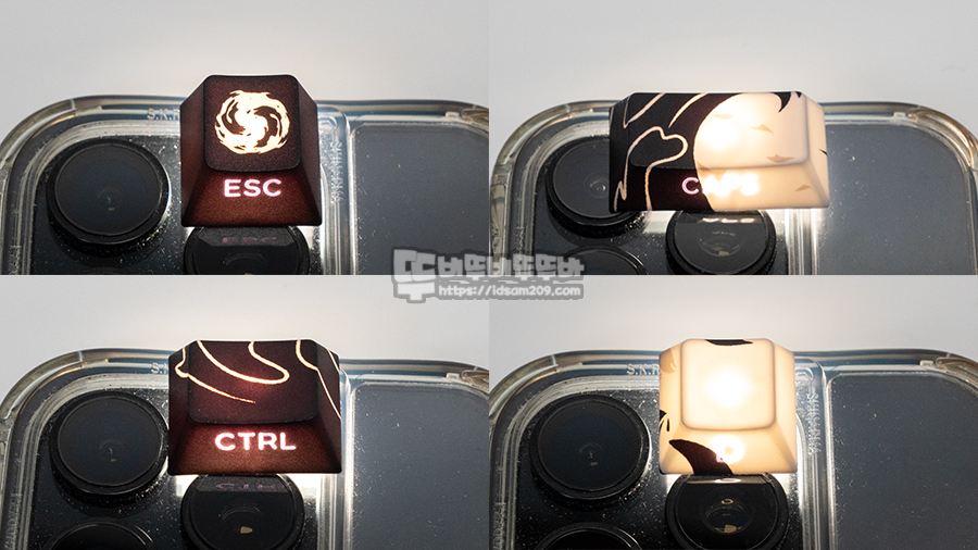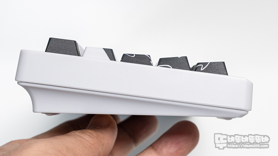 대부분의 키캡은 투명소재 PBT 이중사출이지만 스페이스 바는 화이트 계열에 측각 부분에 투명 소재를 사용하여 약간의 차이를 확인할 수 있지만 키캡의 측각의 빛 투과가 확실히 잘 되는 편이라 좋네요.