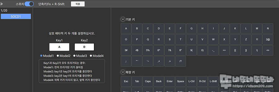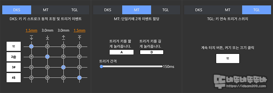 사용자 지정의 키 설정은 키 위치 변경, 콤보 키는 Ctrl, Alt를 포함한 조합키 구성으로 3개 키 까지 조합 구성할 수 있으며 고급 키에서 설정 가능한 DKS( Dynamic Keystroke ) - 누르는 깊이에 따라 최대 4개의 값을 키 입력 한 번에 입력하는 기능, MT( Mod-Tap ) - 짧게 누를 때와 길게 누를때 키값을 다르게 설정하는 기능, TGL( Toggle Key ) - 키를 한 번 누르면 다시 누를 때까지 계속 입력되는 기능 등을 설정할 수 있고요.