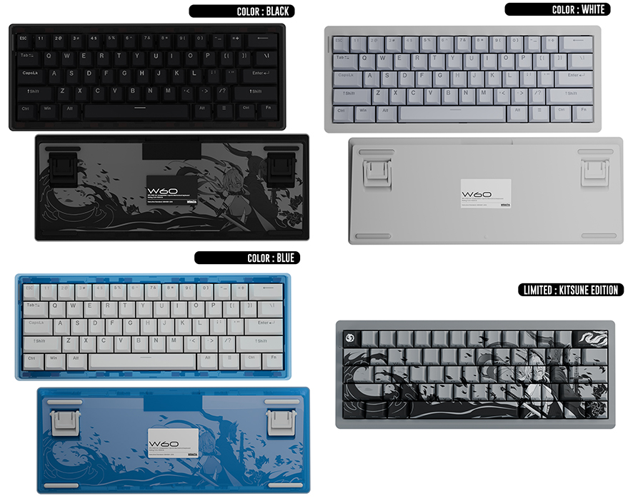 레이스 Wraith W60 8K 시리즈는 키츠네 에디션을 제외한 일반 모델의 경우 블랙/블루는 반투명 하우징을 이용하여 바닥면에 디자인 아트웍이 노출되며 화이트 모델의 경우 키캡을 뽑았을 때 보강판에 디자인 아트웍이 노출되는 차이점이 있어 디자인 요소가 다른 만큼 취향에 맞게 구입하시면 좋은데요.