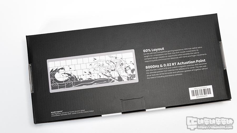 패키지 뒷면에는 60% 미니배열에 대한 정보, 8KHz 폴링 레이트와 0.02mm RT 입력 지점 설정에 대한 정보를 표현하고 있으며 스펙 정보는 다음과 같습니다.