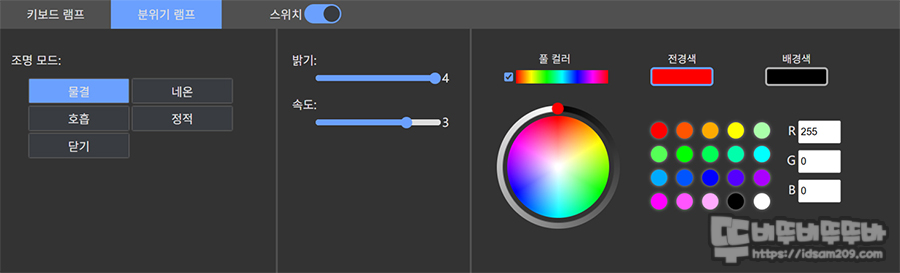 조명 설정에서는 키보드 자판 배열의 백라이트 효과, 분위기 램프로 표기하는 키보드 좌측 상단에 포인트 LED 효과 및 컬러를 지정으로 나만의 컬러를 설정할 수 있습니다.