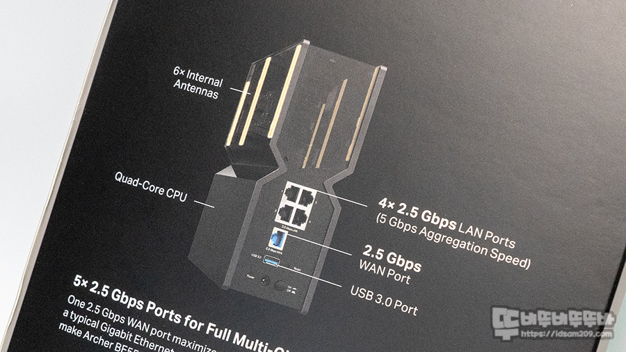 특히 제품의 구성을 설명하는 부분에서는 Quad-Core CPU 내장, 6개의 안테나 내장, 2.5Gbps 랜포트 4개와 Wan 구성, USB 3.0 포트, 별도로 구성된 전원 스위치를 통해 고급스러운 제품임을 예상할 수 있습니다.