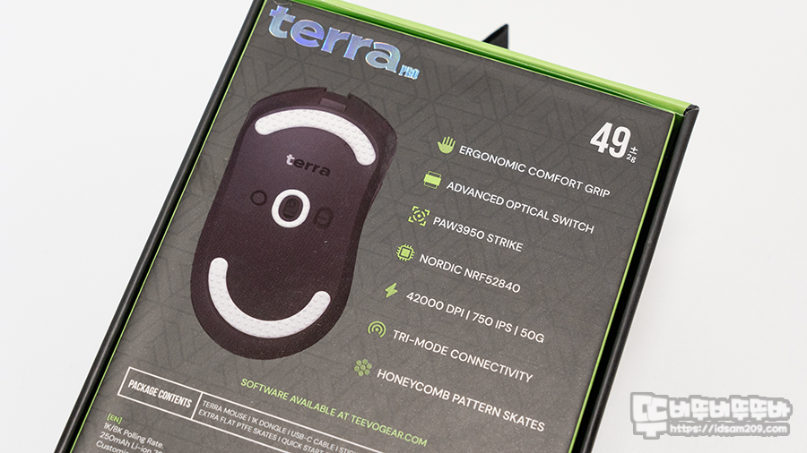테라 프로 패키지에는 제품의 모델명과 PAW 3950 스트라이커 센서 / 8K 폴링 레이트 / 그립감이 좋은 코팅 등의 내용이 강조하고 있고요.